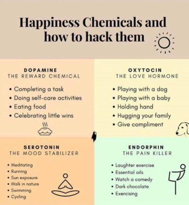 This amazing chart offers an insight into cultivating healthier brain chemistry, by suggesting activities that suppport the different positive chemicals in the brain.